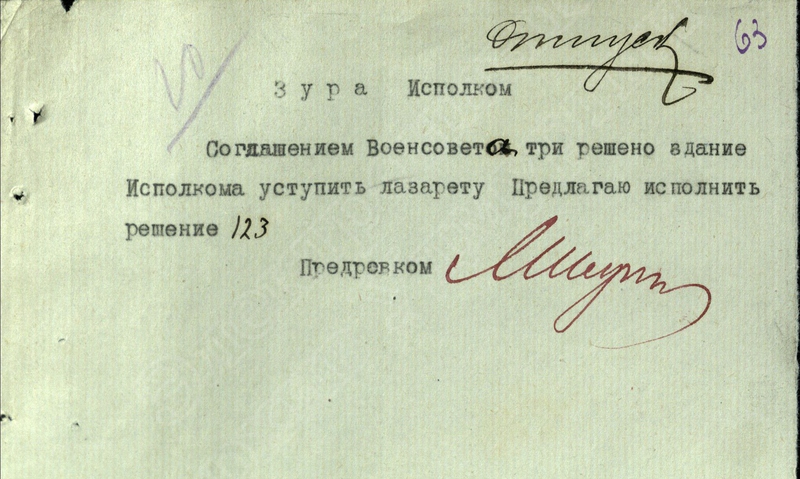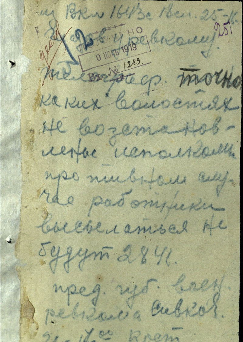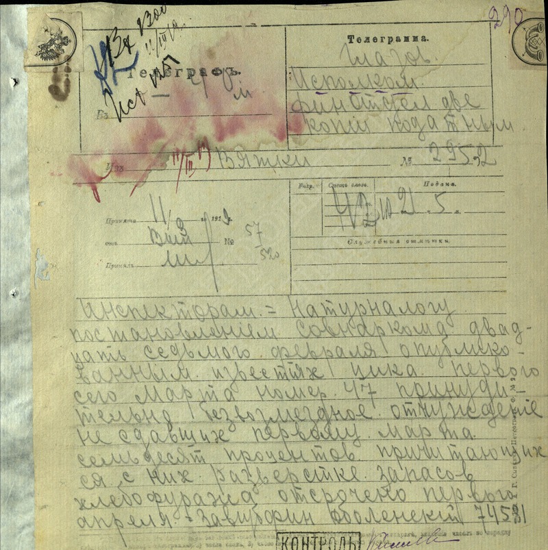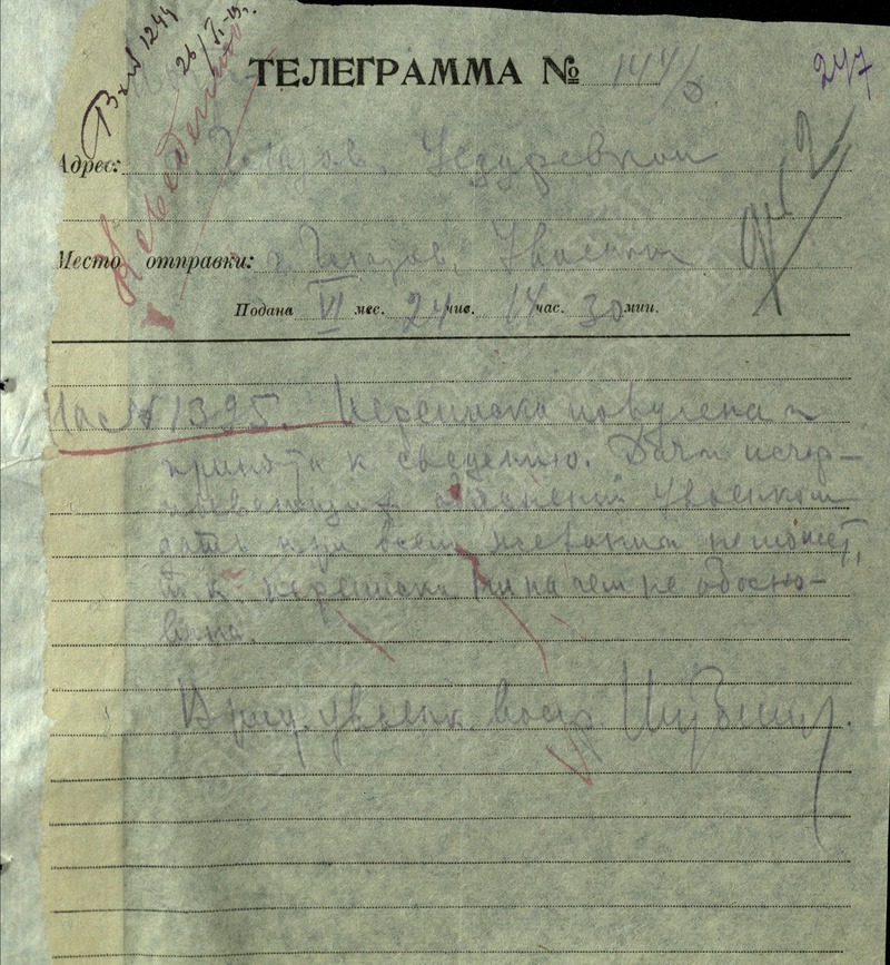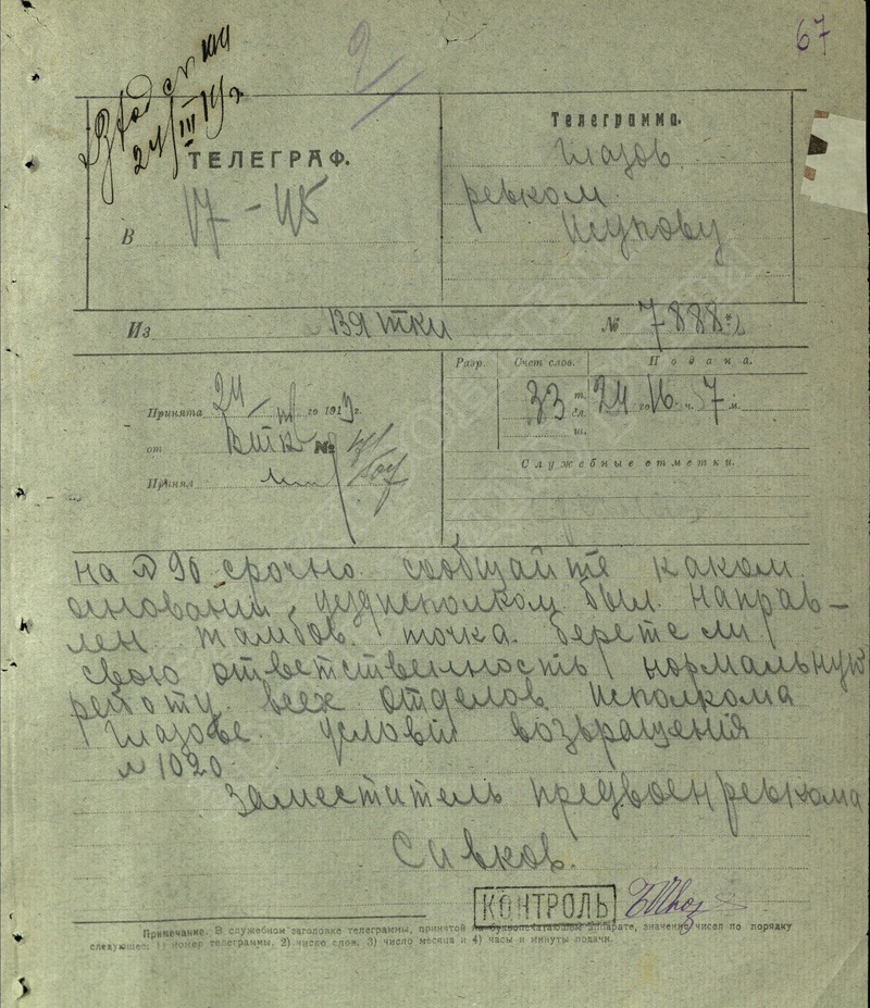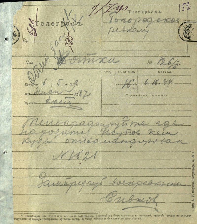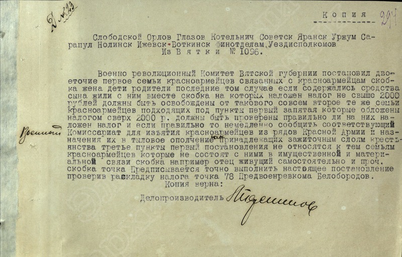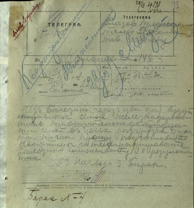 Телеграммы по эвакуации советских учреждений в Шабалино Котельнич и Томбов и положение эвакуированых семейств, об арестованных за неплатежи чрезвычайного налога и мобилизации гужевого транспорта