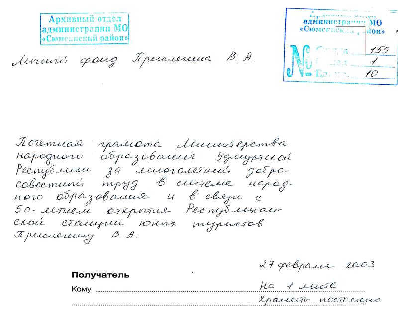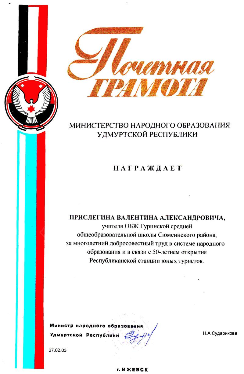Почетная грамота Министерства народного образования Удмуртской Республики за многолетний добросовестный труд в системе народного образования и в связи с 50-летием открытия Республиканской станции юных туристов Прислегину В.А.